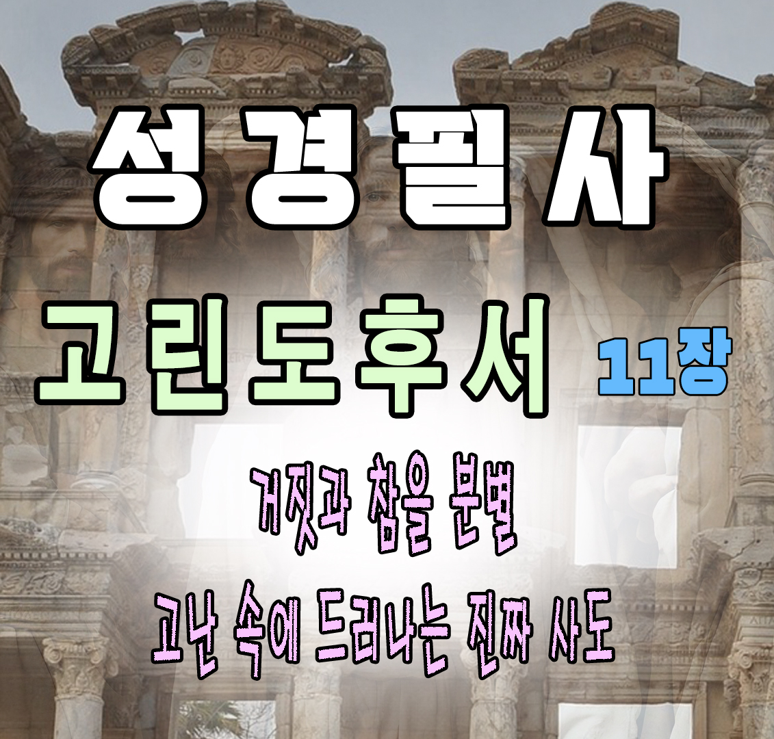 고린도후서 11장에서 바울은 거짓 사도들의 속임수와 그들이 주는 위험을 경고하며, 자신이 얼마나 진정성 있고 헌신적인 사도인지를 변호합니다. 그는 자신의 사도됨을 자랑할 수밖에 없는 어리석음을 용납해달라 부탁하며, 그리스도의 순결한 복음을 왜곡시키려는 이들을 분별할 것을 권고합니다.